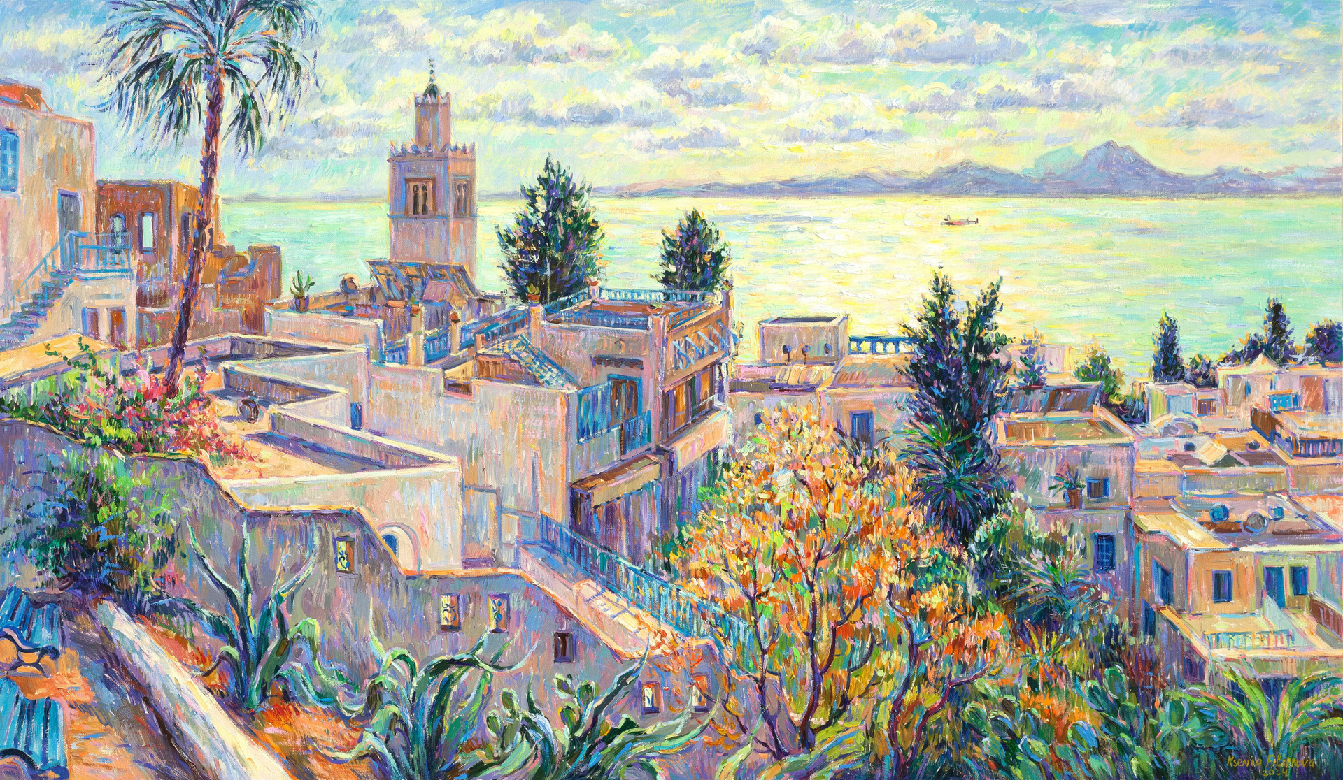 As I paint in Sidi bou Said, the renowned city of artists, I am constantly inspired by its vibrant culture and breathtaking surroundings. The bright blue and white architecture, the Mediterranean Sea, and the lively atmosphere of the village provide an ideal backdrop for my work.